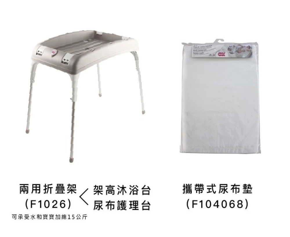- 視需求可自行搭配專用之折疊澡架(F1026) & 可攜式尿布墊(F1040),可為澡架兼尿布台二合一使用