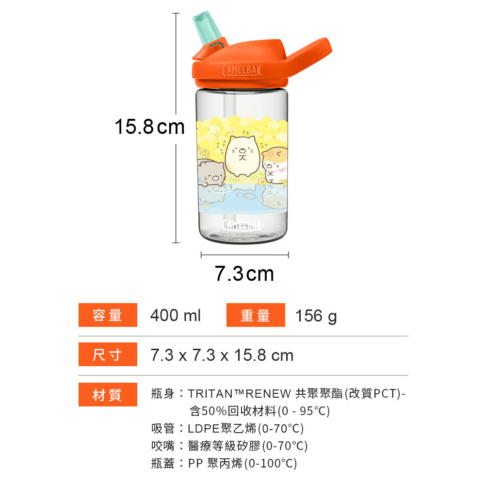 CamelBak 新推出eddy® 兒童吸管運動水瓶,每季推出不同設計圖案及配色,讓大小朋友都愛不釋手。全系列水瓶保證不含環境賀爾蒙 BPA「雙酚A」,並符合歐盟食品容器規範及兒童用容器標準、並符合美國 FDA 認證為安全容器。針對兒童設計的特殊咬嘴,不會因孩童的啃咬而脫落,咬嘴為醫療級矽膠製作,可自動閉合,小朋友的口水不會回流到水瓶中。使用起來安心、安全無負擔!