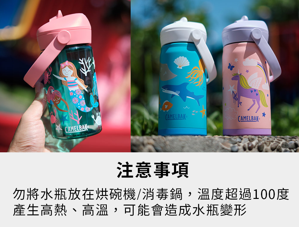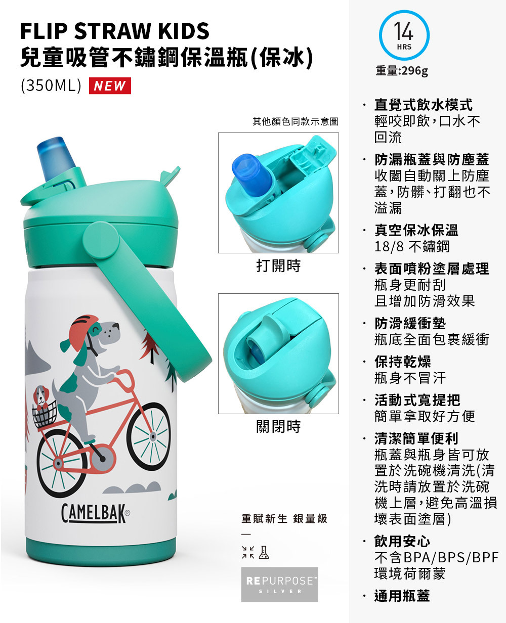 CamelBak 新推出 Flip Straw 兒童吸管運動水瓶,每季推出不同設計圖案及配色,讓大小朋友都愛不釋手。全系列水瓶保證不含環境賀爾蒙 BPA「雙酚A」,並符合歐盟食品容器規範及兒童用容器標準、並符合美國 FDA 認證為安全容器。針對兒童設計的特殊咬嘴,不會因孩童的啃咬而脫落,咬嘴為醫療級矽膠製作,可自動閉合,小朋友的口水不會回流到水瓶中。使用起來安心、安全無負擔!