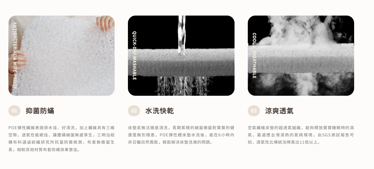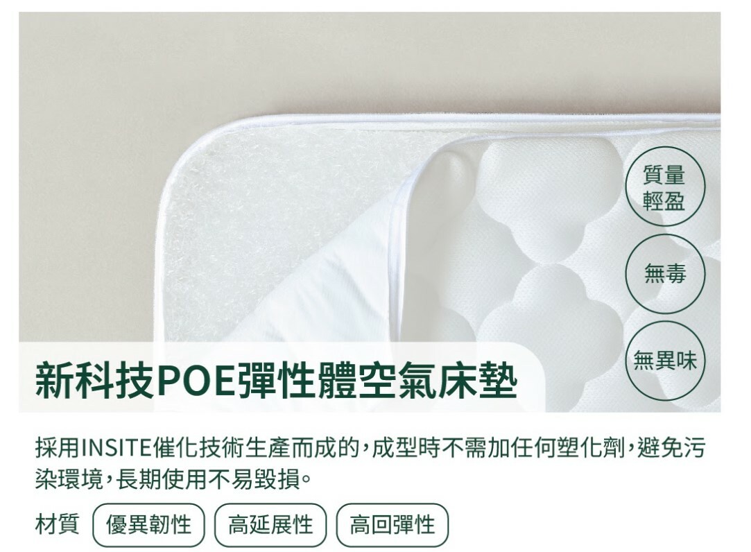 ◆ POE 彈性床墊:採用仿生技術,透氣、防霉、無毒,易於清潔。