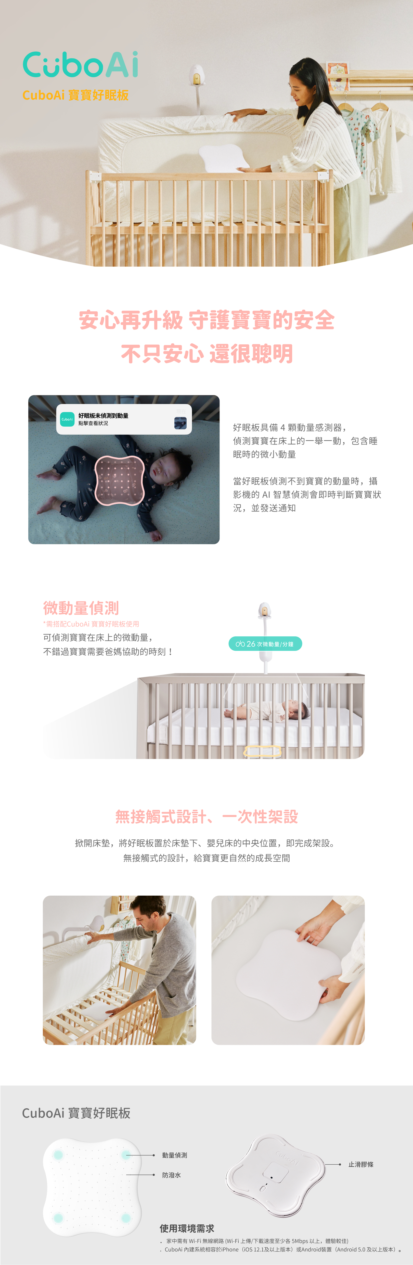 寶寶好眠板必須與 CuboAi 智慧寶寶攝影機搭配使用。好眠板可以偵測寶寶的細微動量,結合攝影機 AI 科技,偵測準確度再升級!