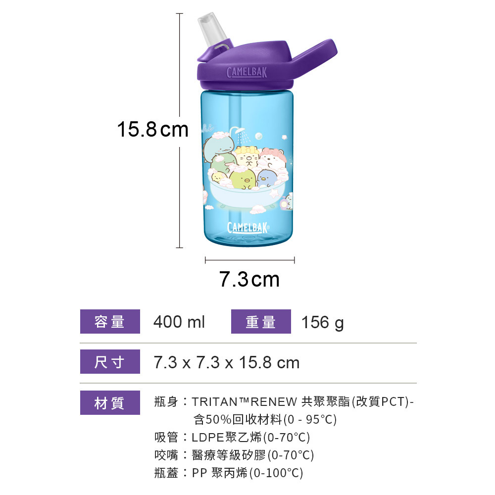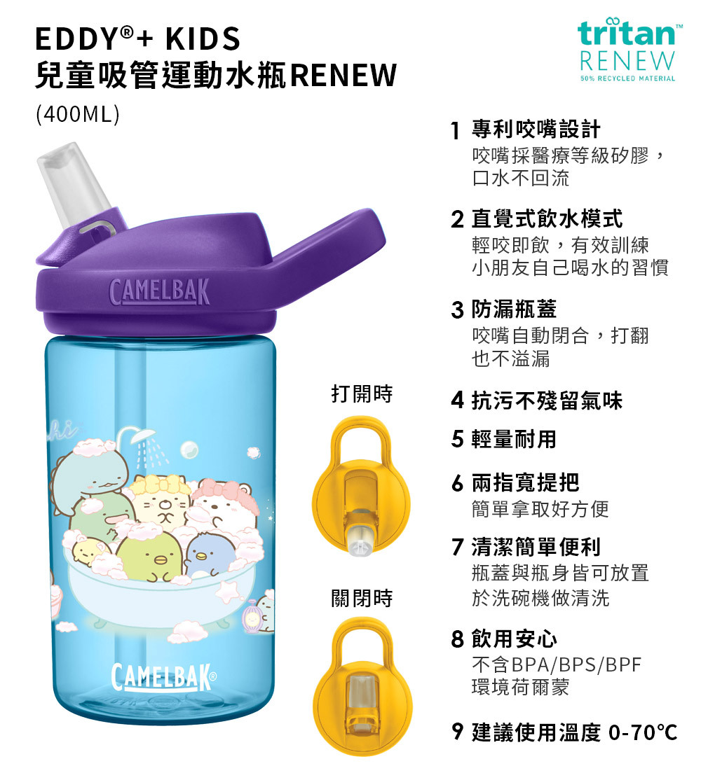 CamelBak 新推出eddy® 兒童吸管運動水瓶,每季推出不同設計圖案及配色,讓大小朋友都愛不釋手。全系列水瓶保證不含環境賀爾蒙 BPA「雙酚A」,並符合歐盟食品容器規範及兒童用容器標準、並符合美國 FDA 認證為安全容器。針對兒童設計的特殊咬嘴,不會因孩童的啃咬而脫落,咬嘴為醫療級矽膠製作,可自動閉合,小朋友的口水不會回流到水瓶中。使用起來安心、安全無負擔!