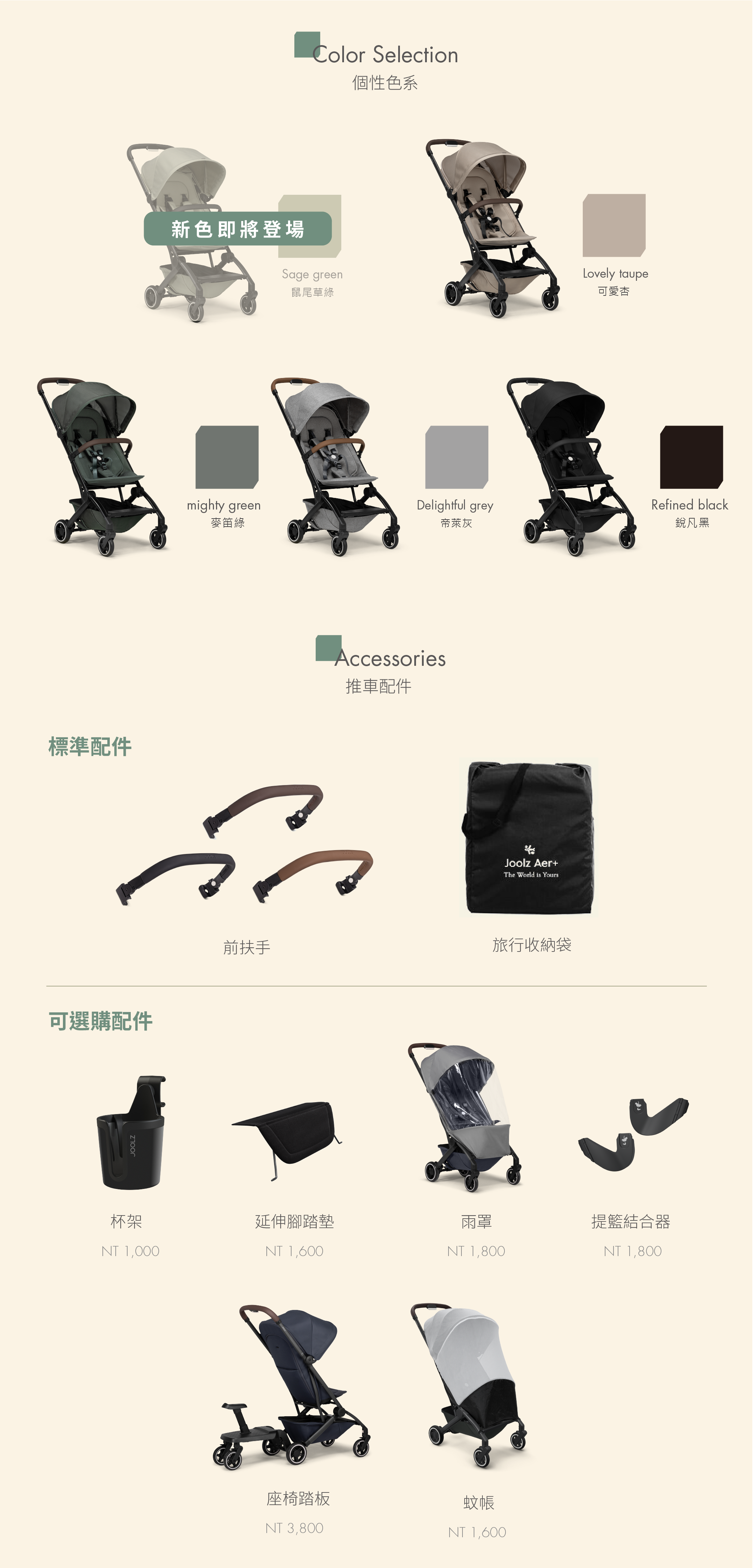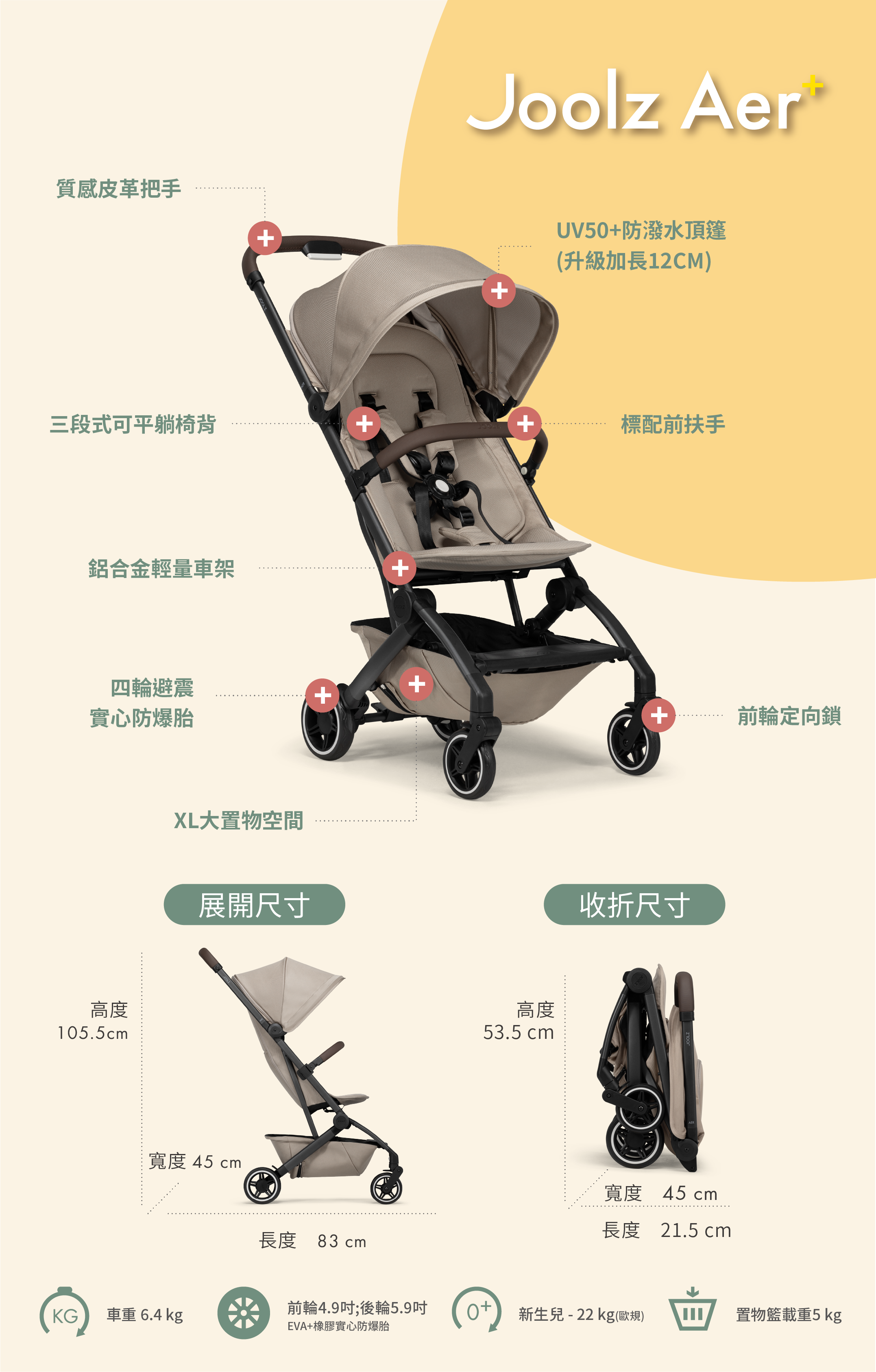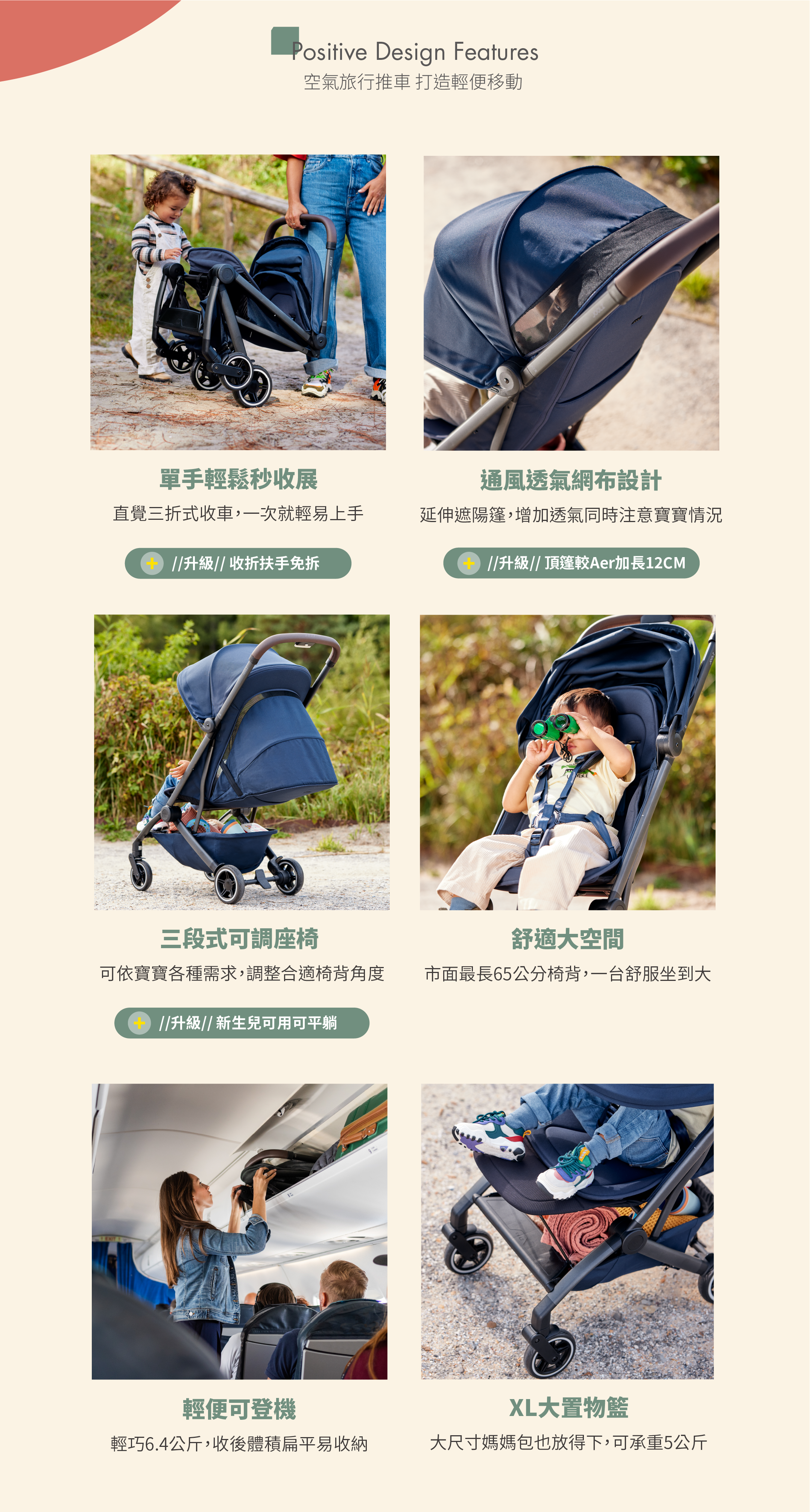 完美解決旅行時輕便、登機、好推的嬰兒推車需求。除了延續Aer的穩定結構、緊湊收折以及輕巧便攜...等特性外