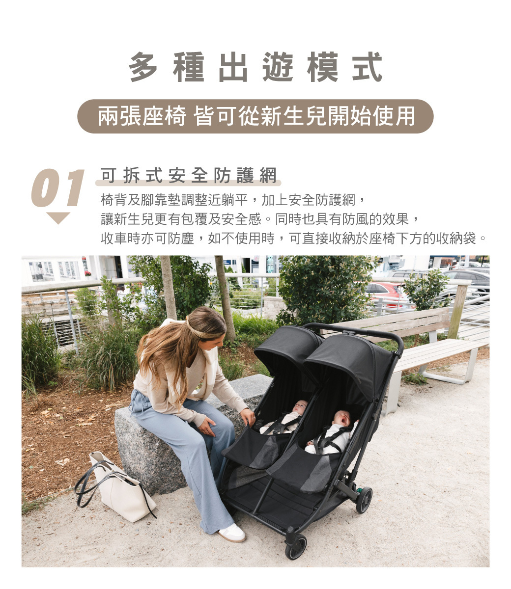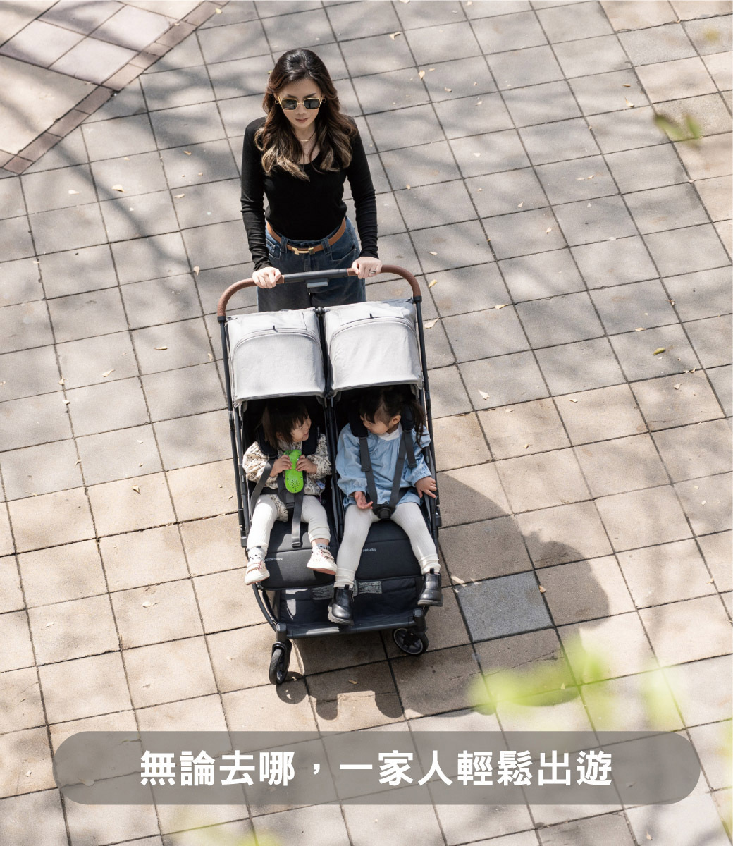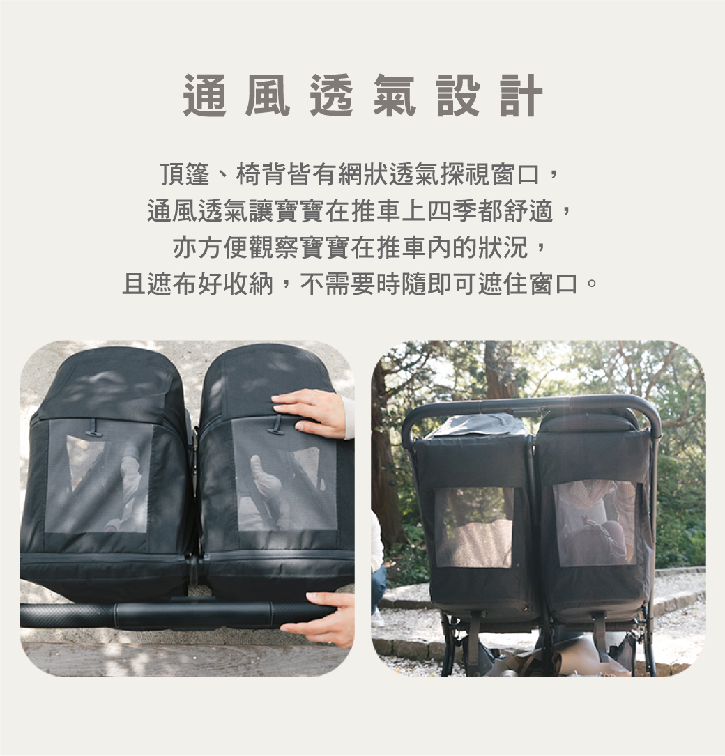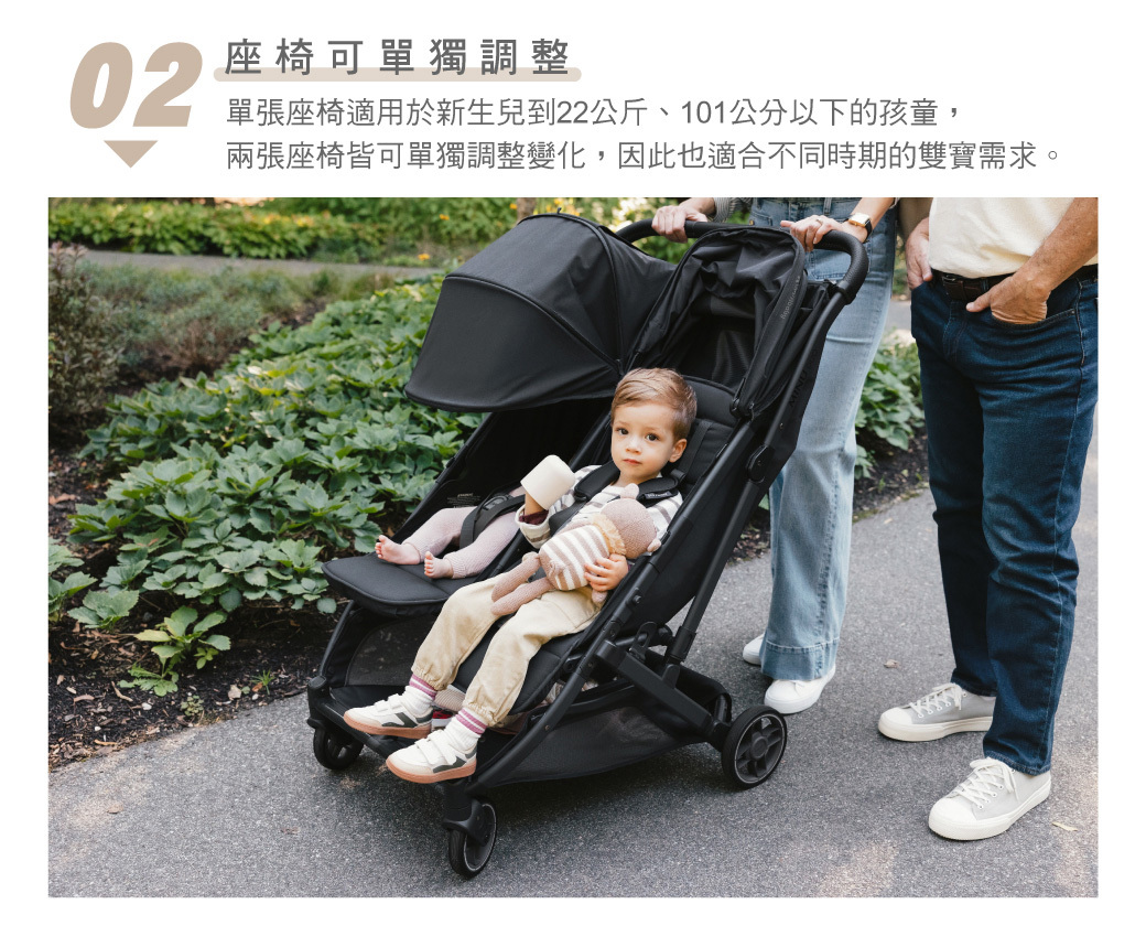 ●兩張座椅、腳踏墊、椅背及遮陽篷皆可各別調整,