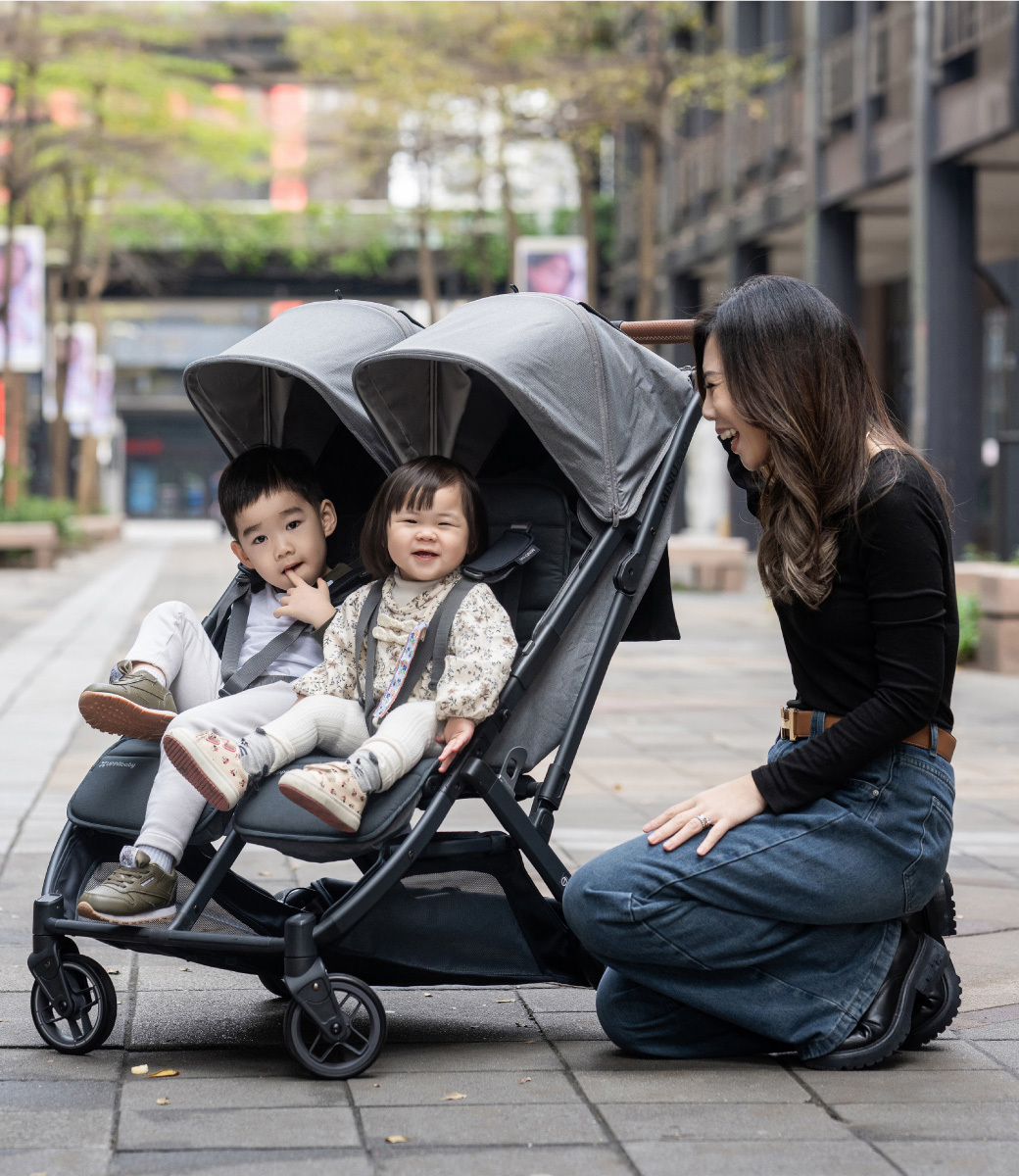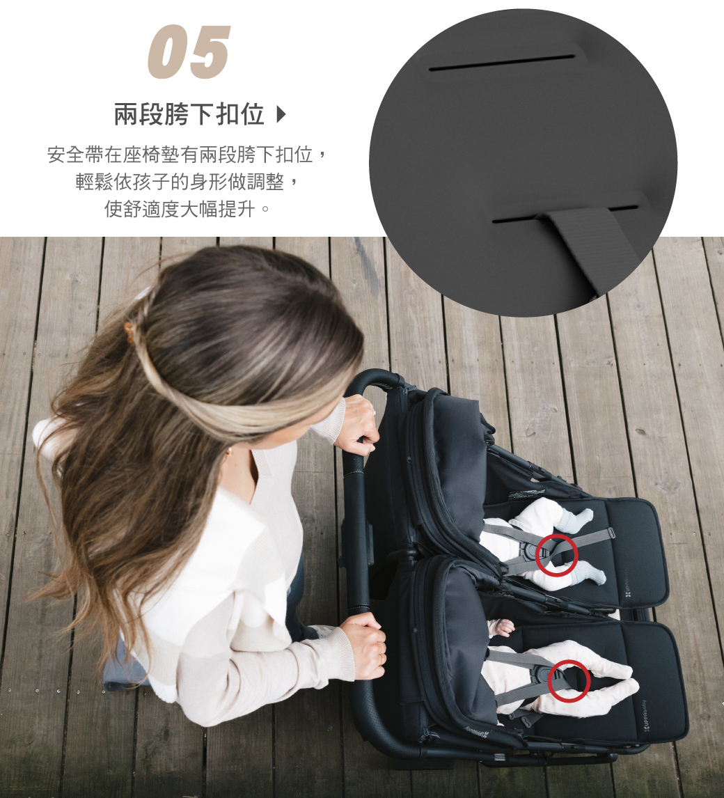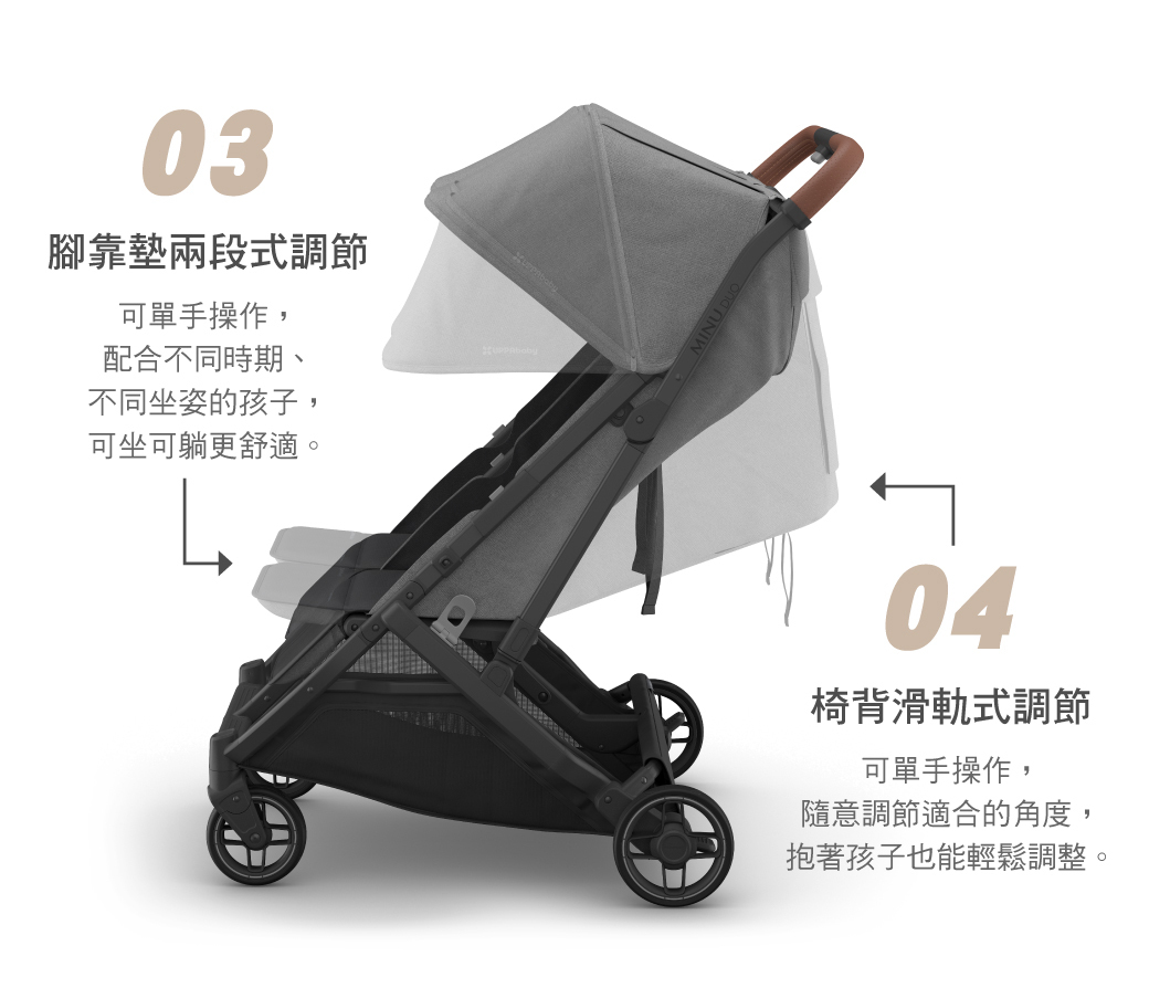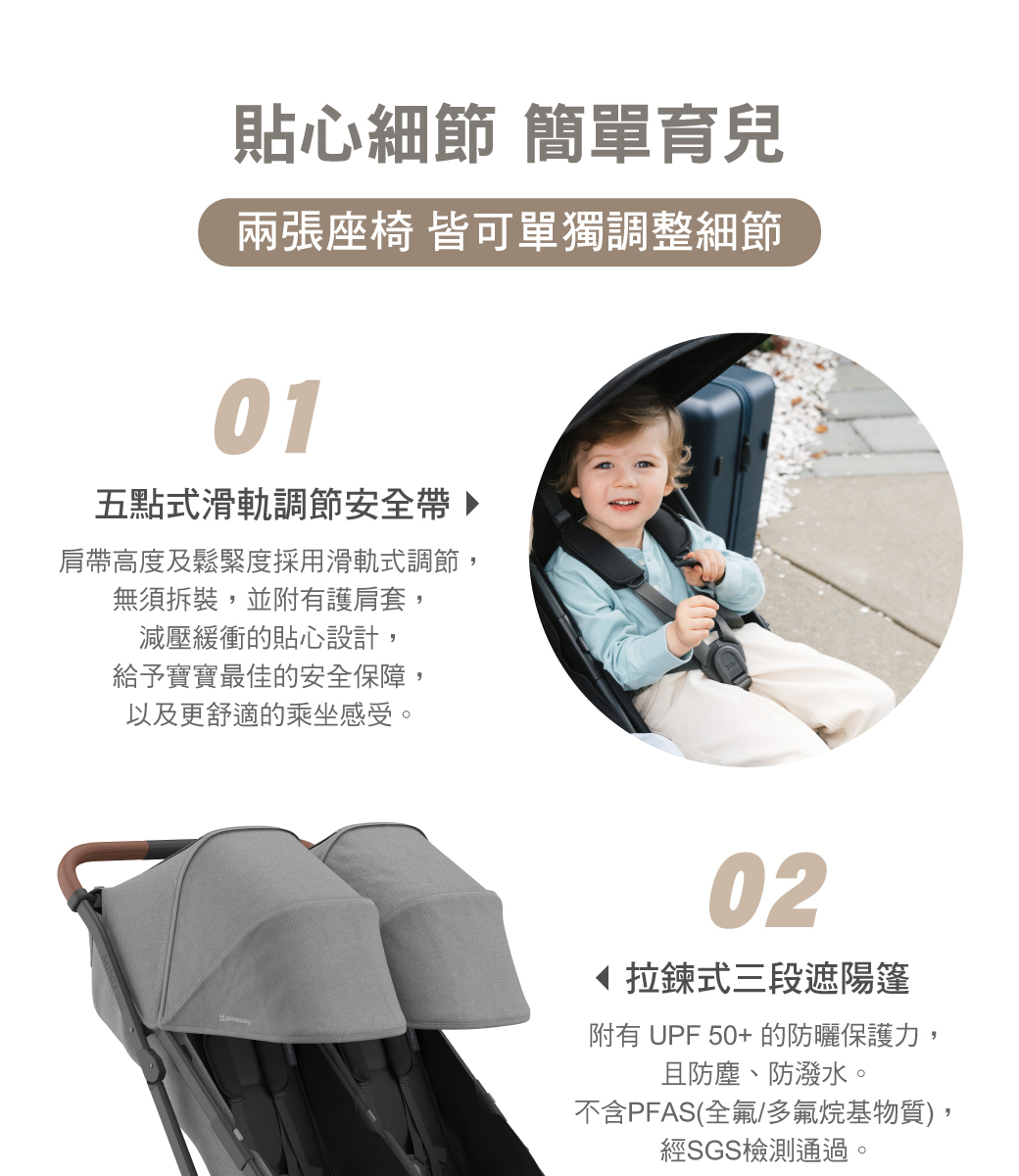 ●兩張座椅、腳踏墊、椅背及遮陽篷皆可各別調整,