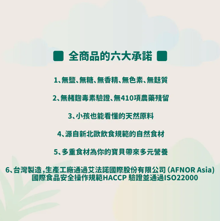 •本產品生產工廠通過艾法諾國際股份有限公司(AFNOR Asia)國際食品安全ISO22000操作規範HACCP驗證