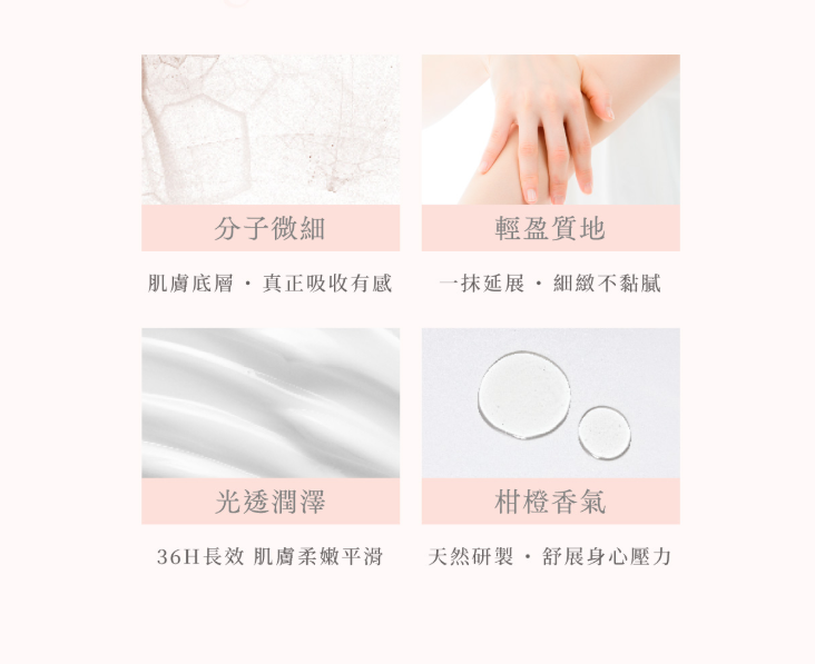 分子細小肌膚極快速吸收/添加玫瑰籽&橄欖精華油/無油脂黏膩感/搭配按摩去水腫/ 清新柑橙香氣